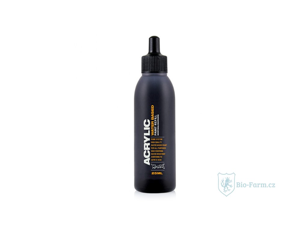 Lahvičky ACRYLIC PAINT Refill jsou stejné vysoce kvalitní barvy na vodní bázi, které jsou netoxické, schválené ACMI a nesou značku AP. Montana ACRYLIC 25ml je nejen ideální pro doplňování vašich AKRYLOVÝCH popisovačů Montana, ale také nabízí širokou škálu možných aplikačních technik, jako je air brush, smíšená média, nanášení štětcem a samozřejmě je lze kombinovat s odpovídající barvou z řady barev ve spreji Montana GOLD. . Lze aplikovat na téměř všechny povrchy, jako je plátno, dřevo, sklo, stěny a kov. Lahve jsou průhledné pro snadné posouzení zbývajícího obsahu. Ideální pro použití pro airbrush! Použití v kombinaci s prázdnými popisovači Montana ACRYLIC 0,7mm, 2mm, 15mm, 30mm a 50mm. Bez rozpouštědel. Ředitelný vodou.