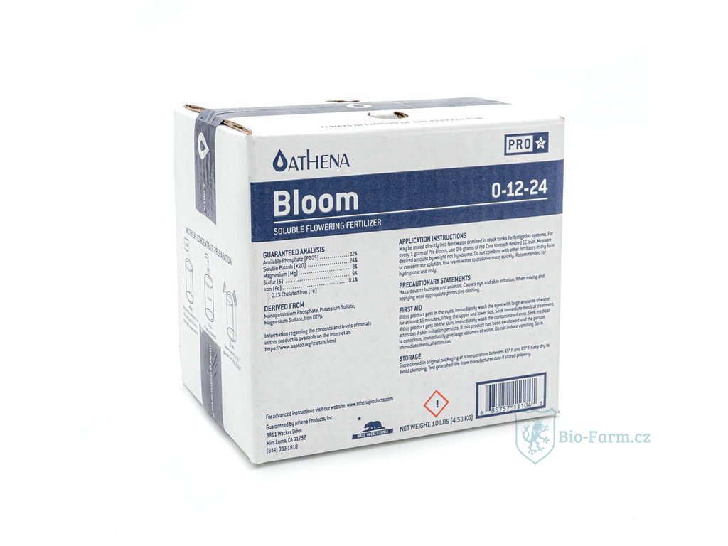 Kvetoucí rostliny vyžadují vyšší množství fosforu (P) a draslíku (K), aby zvýšily objem květů a podpořily vysokometabolické aktivity. Athena Pro Bloom přispívá vyváženým množstvím makro a mikroprvků včetně síry (S) používaných pro zvýšení účinnosti a chuti.