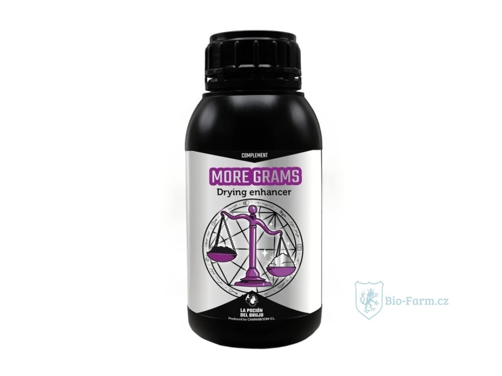 MORE GRAMS je světově unikátní přípravek: díky němu vaše plodiny v procesu sušení ztrácejí méně na hmotnosti. Funguje tak, že zvyšuje retenci vody v květu, opětovně hydratuje prostor mezi vlákny a umožňuje asimilaci této vody bohaté na živiny v závěrečné fázi kvetení. Organická hmota se zvýší těsně před řezem, což umožní, aby květ během fáze sušení ztratil o 10 % / 20 % méně hmotnosti.