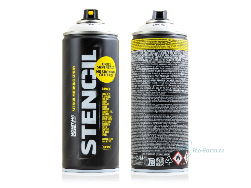 Ideální pro různé aplikace, Montana STENCIL Spray vyniká v projektech pouličního umění, reklamě, guerilla marketingu, workshopech a obecných potřebách značení. Díky nízkému zápachu je také vhodný pro vnitřní použití ve studiu. STENCIL Spray je k dispozici v černé a bílé barvě a má matný povrch a je vybaven uzávěrem Flat-Jet Medium pro snadnou manipulaci a přesnou aplikaci. Střední tlak spreje usnadňuje ovládání, umožňuje čisté linie a profesionální vzhled. Tato vysoce kvalitní barva ve spreji vyrobená v Německu je díky svému speciálnímu složení částečně odolná vůči slané vodě, takže je vhodná pro průmyslové i umělecké potřeby.