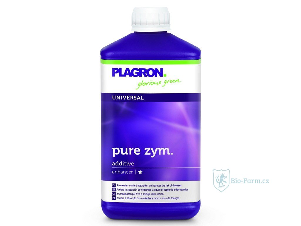 Plagron Pure Zym obsahuje proteiny produkující bakterie a houby, které fungují jako biokatalyzátor při látkové přeměně molekul na jiné pro rostliny snáze vstřebatelné. Tak může rostlina přijímat živiny a kyslík neustále v optimálním množství.