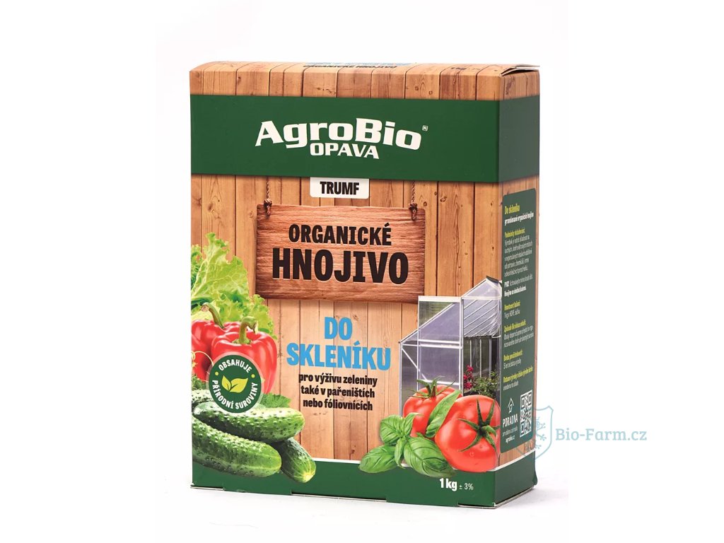 TRUMF organické hnojivo do skleníku je granulované organické přírodní hnojivo vyrobené především z kostní moučky, péřové moučky, krevní moučky, kakaových slupek a vinassy (melasových výpalků). Organické dlouhodobě působící hnojivo je vhodné pro pěstování zeleniny ve sklenicích, pařeništích nebo fóliovnících. Použití v bio zahrádce, ekologickém pěstování, bio pěstování. Ideální výživa z přírody pro rostliny salátu, rajčat, okurek, paprik aj. Vyrovnaný poměr živin podporuje jak růst tak tvorbu plodů zeleniny. Přírodní hnojivo s okamžitým účinkem působí po dobu až 3 měsíců.