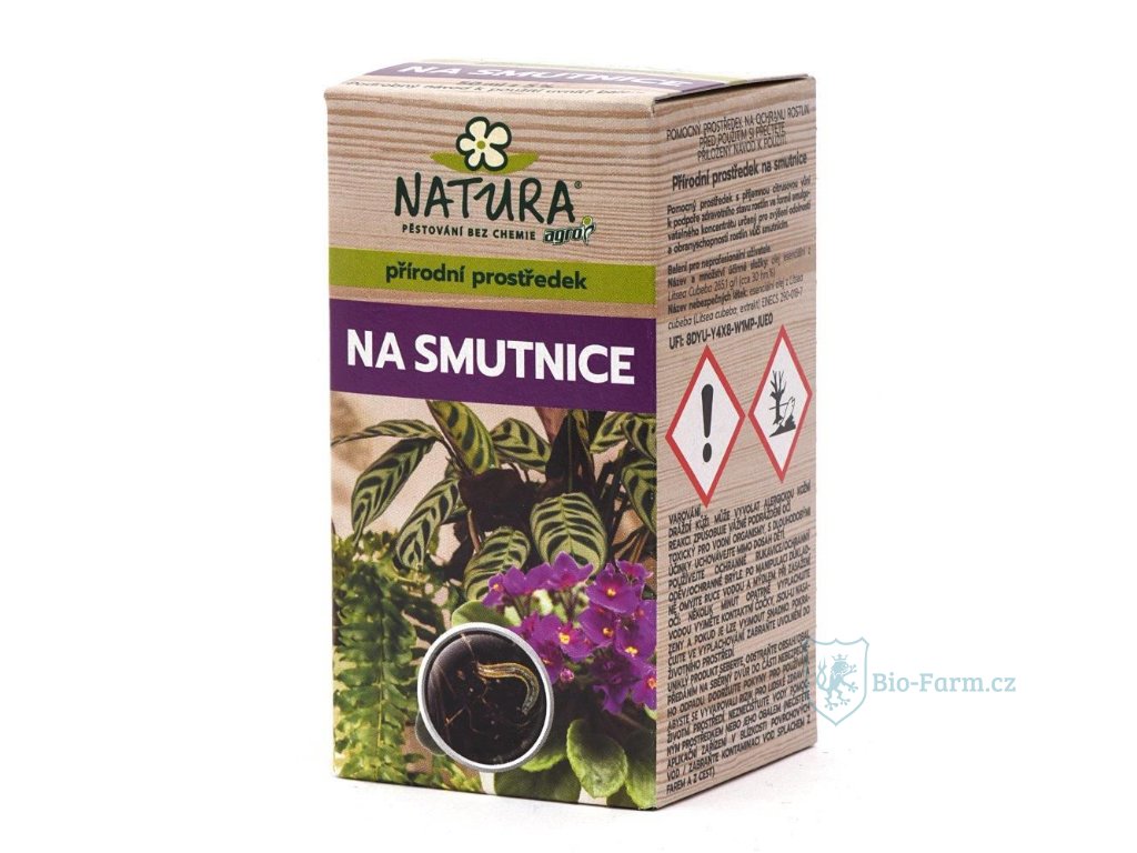 Agro Natura Přírodní prostředek na smutnice je přírodní přípravek s UNIKÁTNÍ RECEPTUROU na bázi přírodních látek s příjemnou citrusovou vůní, který zamezí výskytu mušek smutnic. Hubení smutnic - larvy se po aplikaci přestanou vyvíjet; dospělci do ošetřené zeminy už nová vajíčka nekladou. Přírodní postřik proti smutnicím vytváří po aplikaci v půdě nevhodné prostředí pro vývoj larev smutnic, proto dospělci preferují pro kladení vajíček jiné stanoviště. Přítomnost oleje na povrchu substrátu působí i fyzikálně. Tím dochází ke zlepšení odolnosti a obranyschopnosti rostlin vůči smutnicím. Přípravek na smutnice také snižuje a omezuje tvorbu bílé plísně na povrchu půdy. Likvidace smutnic přírodní cestou, bez ochranné lhůty.