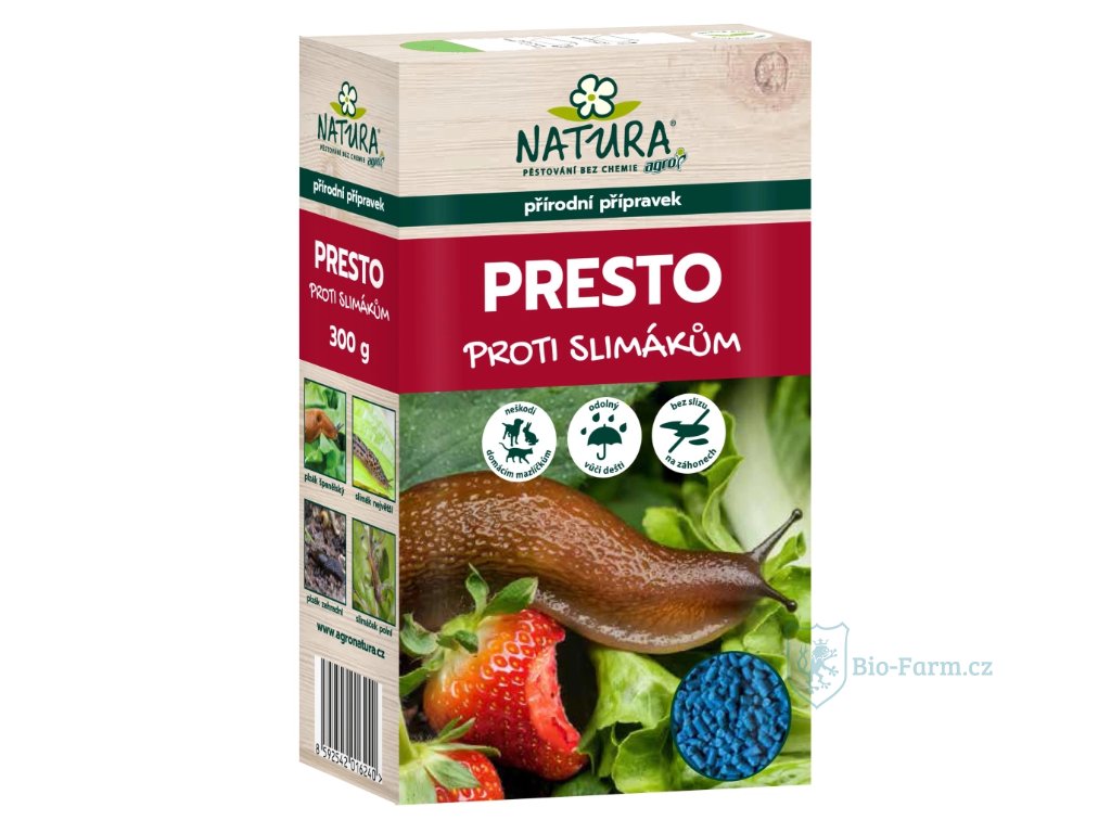 NATURA Presto proti všem druhům slimáků a plzáků na venkovních záhonech, ve skleníku i pařeništi. Je vysoce účinný – unikátní formulace, k usmrcení škůdců stačí menší porce návnady než u konkurenčních produktů (účinná látka ovlivní metabolismus škůdců, což vede k rychlejšímu pocitu sytosti, snížení žravosti, přestává se tvořit hlen a škůdce leze do úkrytu).