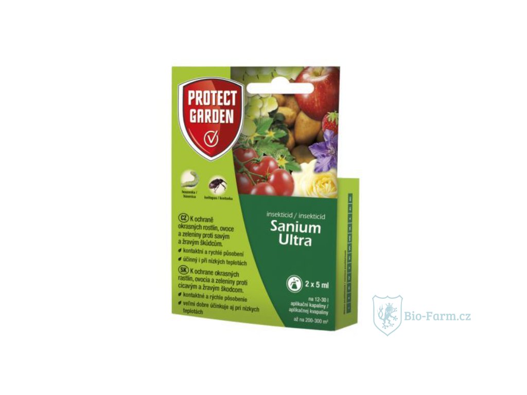 Ochraňte vaše okrasné rostliny, ovoce i zeleninu proti savým a žravým škůdcům. Sanium Ultra je kontaktní insekticidní přípravek, který působí okamžitě po aplikaci a jeho výhodou je, že účinkuje i při nízkých teplotách. Při vysokých teplotách (nad 24 °C) se účinnost pyrethroidních účinných látek může snižovat. V těchto případech je vhodné insekticidy s pyrethroidní účinnou látkou aplikovat po poklesu teplot, obvykle časně ráno nebo později večer.