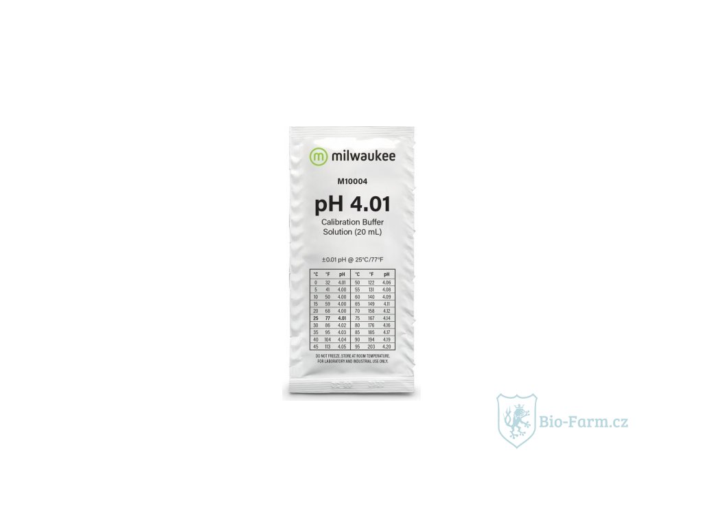 Milwaukee kalibrovací roztok pH 4,01. Sáček o objemu 20ml. Pro přístroje na měření pH ve vodě nebo živném roztoku.