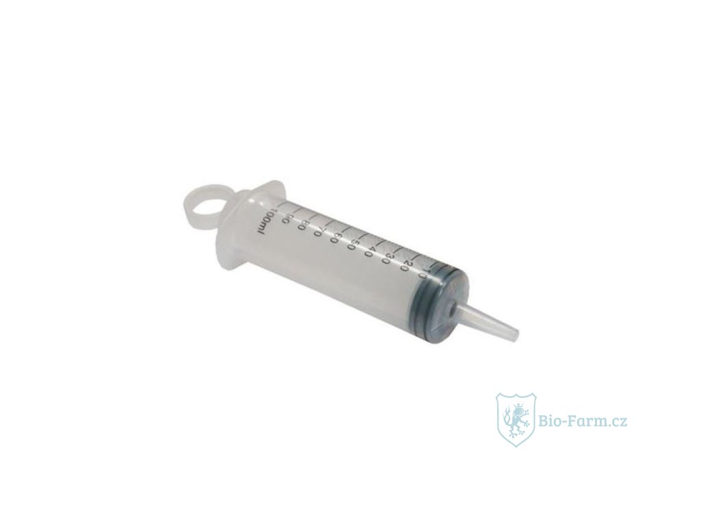 Vyplachová jednorázová injekční stříkačka, 100 ml, černá se stupnicí.