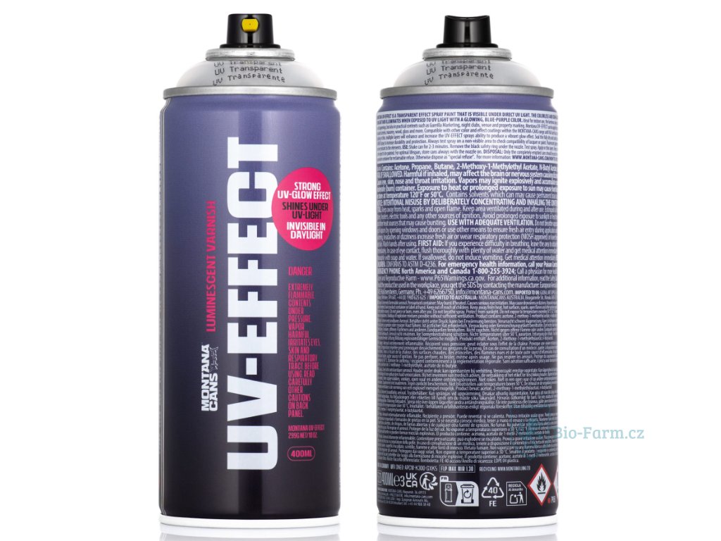Montana UV-EFFECT je transparentní efektní barva, která je viditelná pouze pod přímým UV světlem. Bezbarvá a pololesklá barva, kterou lze nastříkat na téměř jakýkoli podklad, není na slunci vidět, ale při vystavení UV světlu se rozzáří zářící modrofialovou barvou. Svítící sprej, ideální pro vnitřní použití, může být skvělým nástrojem nejen pro vytváření umění nebo uměleckých akcí ale také v praktických kontextech, jako je reklamní marketing, noční kluby a pro označení nemovitostí.