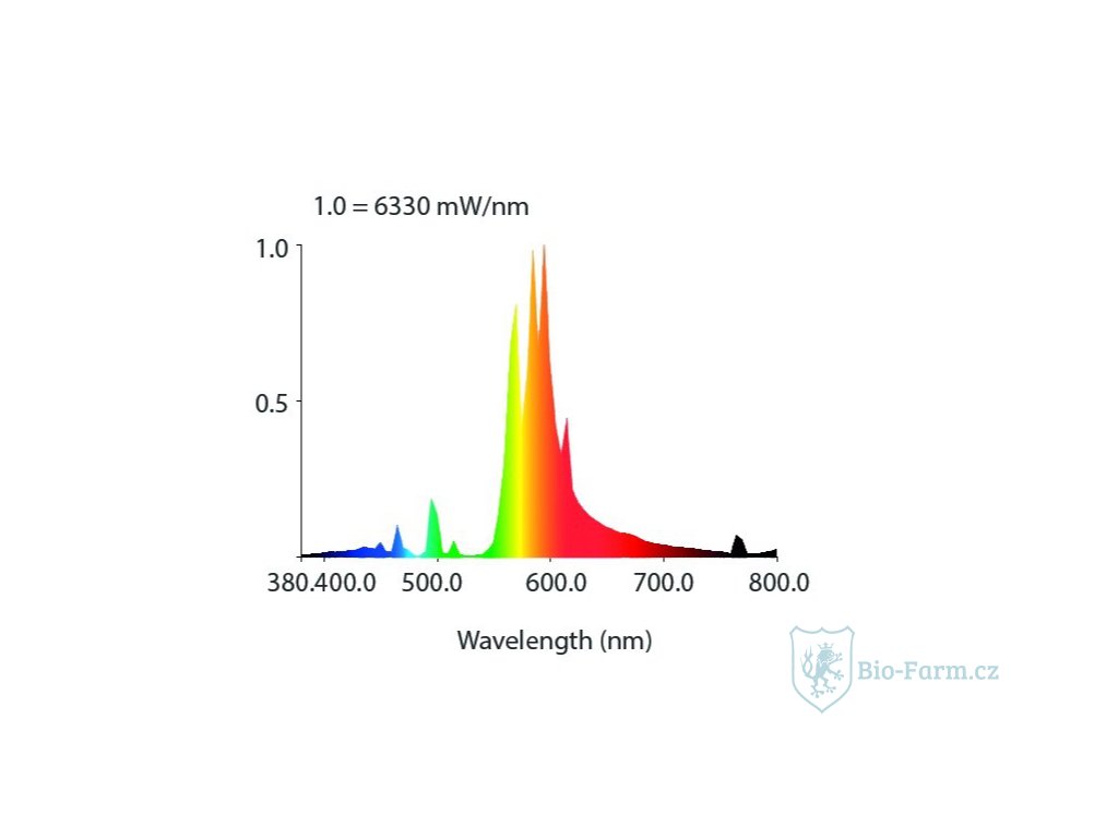 - Spektrum: Vysoký poměr červenožlutého světla
